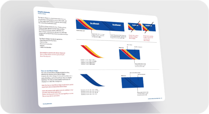 Graphic elements Warrior Stripes The Warrior Stripes is a visual device taken from our aircraft design and applied to check-in back walls, and in other large-scale contexts to quickly communicate the overarching Southwest brand. The Warrior Stripe includes five lines. The two primary stripes are Warm Red and Sunrise Yellow, and they Check-in back wall are bracketed by thinner, tapered white lines. The Do not crop in a way that Warrior Stripe must always be displayed on a Bold Blue Always include the bottom edge of A second Tone-on-tone Warrior Stripes may Do not create a pattern background, so that all three of our core colors are shown the Warrior Stripes to ensure the be introduced for back walls longer than 45'. by adding additional modifies or obscures the together. curved portion is visible. (See pages below for back wall details.) Warrior Stripes. curvature of the Warrior Stripes. The Warrior Stripes may also be applied to: • Rapid Rewards (Coming Soon) • Sponsorships Warrior Stripes • Email communication Bold Blue background • Airport When in use • Select merchandise Any exceptions regarding the Warrior Stripe and Tone-on-Tone Stripes must be approved by the Brand Identity team. Southwest_colored_stripes_cmyk.ai Southwest_colored_stripes_cut-vinyl.ai Southwest_colored_stripes_OOH.ai Southwest_colored_stripes_rgb.ai Always include the bottom edge of the Warrior Stripes to ensure the curved portion is visible. Tone-on-tone Warrior Stripes The Tone-on-tone Warrior Stripes includes five lines, Tone-on-tone Warrior Stripes retaining the structure of the Warrior Stripes. Bold Blue background However, the colors change: the two primary stripes are a When in use darker Bold Blue, and the three thinner lines are a lighter Bold Blue. The Tone-on-tone Graphic must always be displayed on a Bold Blue background. Note: The Tone-on-tone Warrior Stripes should only be used for airport back walls accompanied by Warrior Stripes. OOH—Art prepared with optimal colors for printing on vinyl Southwest_tone-on-tone_stripes_cmyk.ai and other large-format applications. Southwest_tone-on-tone_stripes_cut-vinyl.ai Online—Art prepared to ensure the best legibility on-screen. Southwest_tone-on-tone_stripes_OOH.ai This art may only be used online. Southwest_tone-on-tone_stripes_rgb.ai Always include the bottom edge of the Warrior Stripes to ensure the curved portion is visible. The Visual Elements Southwest Airlines Brand Style Guide | 36