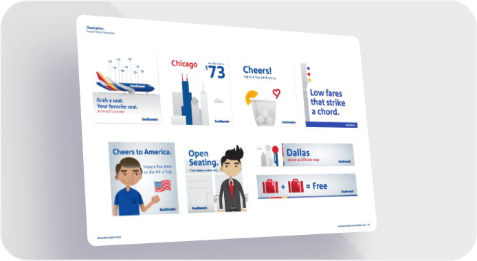 Illustration Social Media Examples $ one-way as low as $ 73 $$ $ one-way as low as one-way as low as $$ 73 one-way as low as 73 $ 73 $ 73 73 73 73 Chicago $$ 73 $ Chicago Chicago 73 Chicago 73 $ 73 $ Cheers! $ 73 $ $ $$ $ $ $ 73 Cheers! Cheers! $$ 73 Cheers! $ 73 73 73 $$ 73 $ 73 73 73 $ 73 73 $73 $ 73 Enjoy a free drink on us. $$ $ 73 $$ $$ 73 $ $ 73 73 73 73 Enjoy a free drink on us. 73 Enjoy a free drink on us. 73 73 Enjoy a free drink on us. 73 73 73 73 73 Grab a seat. Grab a seat. Grab a seat. Grab a seat. Your favorite seat. Your favorite seat. Your favorite seat. Your favorite seat. as low as $73 one-way as low as $73 one-way as low as $73 one-way as low as $73 one-way Cheers to America. Open Dallas Dallas Dallas Dallas as low as $73 one-way as low as $73 one-way as low as $73 one-way 73 Seating. as low as $73 one-way Enjoy a free drink on the 4th of July. That makes us smile, too. + = Free Free Free + = Free + = + = Illustration Style Guide Southwest Airlines Brand Style Guide | 50