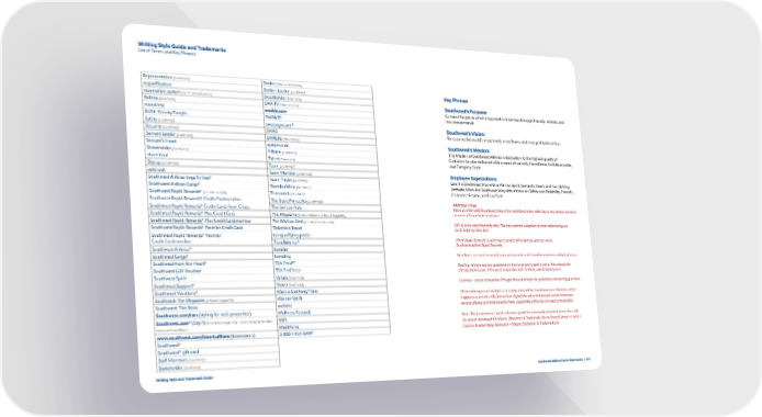 Writing Style Guide and Trademarks List of Terms and Key Phrases Representative [Southwest] Station [SWA work location] requalification Station Leader [Southwest] Key Phrases reservation system [no “s” on reservation] Stockholder [Southwest] Southwest’s Purpose: Retiree [Southwest] SWA TV [internal video] Connect People to what’s important in their lives through friendly, reliable, and round trip swabiz.com low-cost air travel. RUSH Priority Freight SWABIZ® Safety [Southwest] swacargo.com® Southwest’s Vision: Security [Southwest] SWAG To become the world’s most loved, most flown, and most profitable airline. Servant Leader [Southwest] SWALife [intranet site] Southwest’s Mission: Servant’s Heart systemwide The Mission of Southwest Airlines is dedication to the highest quality of Shareholder [Southwest] T-Point [Southwest] Customer Service delivered with a sense of warmth, friendliness, individual pride, short-haul Talent [Southwest] and Company Spirit. Skycap [Southwest] Team [Southwest] sold-out Team Member [Southwest] Employee Expectations: Southwest Airlines bags fly free® Team Player [Southwest] Live the Southwest Way with a Warrior Spirit, Servant’s Heart, and Fun-LUVing Southwest Airlines Cargo® Teambuilding [Southwest] Attitude. Work the Southwest Way with a focus on Safety and Reliability, Friendly Southwest Rapid Rewards® [see note at right] Teamwork [Southwest] Customer Service, and Low Costs Southwest Rapid Rewards® Credit Cardmember The Basic Principles [Southwest] Additional Notes: Southwest Rapid Rewards® Credit Cards from Chase The Golden Rule Terms marked with [Southwest] should be capitalized when referring to any person, location, Southwest Rapid Rewards® Plus Credit Card The Magazine or event affiliated with Southwest. [shortened title of onboard magazine] Southwest Rapid Rewards® Plus Credit Cardmember The WNdow Seat [internal news program] LUV is to be used internally only. The one external exception is when referencing our Southwest Rapid Rewards® Premier Credit Card Ticketless Travel stock ticker symbol, LUV. Southwest Rapid Rewards® Premier tier qualifying points ® Credit Cardmember Transfarency® When Rapid Rewards is advertised outside SW channels, add our name, Southwest Airlines® traveler Southwest before Rapid Rewards Southwest Cargo® traveling Headlines—no need to include punctuation unless the headline contains multiple phrases. Southwest from the Heart® TSA Pre ® Spelling—if there are any questions on how to properly spell a word, first consult the Southwest LUV Voucher TSA PreCheck Writing Style Guide. If the word in question isn’t in there, use dictionary.com. Southwest Spirit Values [Southwest] Southwest Support® Vision [Southwest] Grammar—please consult the Chicago Manual of Style for guidelines concerning grammar. Southwest Vacations® Wanna Get Away® fare When referring to our website as an entity, it should be: Southwest.com. However, when Southwest: The Magazine [onboard magazine] Warrior Spirit it appears as part of a URL (primarily in digital) the entire link should remain lowercase: Southwest: The Store website www.southwest.com/insertrestofurlhere. Hyperlinks online do not need to be bolded. Southwest.com/cars (styling for web properties) Wellness Rewards Southwest.com® (Cap S) In creative usage only - does not apply to rules/ WiFi Note: The list shown is a quick reference guide for commonly searched items. For a full terms and conditions. WorkPerks list, please download the Master Disclaimer & Trademark List via Brand Central > Learn > www.southwest.com/inserturlhere (lowercase s) 1-800-I-FLY-SWA® Creative & Advertising Reference > Master Disclaimer & Trademark List. Southwest® Southwest® gift card Staff Members [Southwest] Stakeholder [Southwest] Writing Style and Trademark Guide Southwest Airlines Brand Style Guide | 117