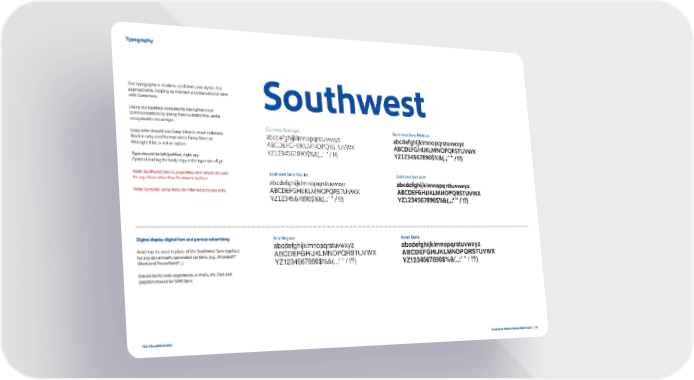 Typography Our typography is modern, confident, and stylish. It is approachable, helping us maintain a conversational tone with Customers. Southwest Using our typeface consistently strengthens our communications by giving them a distinctive, easily recognizable visual style. Southwest Sans Light Southwest Sans Medium Copy color should use Deep Silver in most instances. abcdefghijklmnopqrstuvwxyz abcdefghijklmnopqrstuvwxyz Black is only used for text when Deep Silver or ABCDEFGHIJKLMNOPQRSTUVWX ABCDEFGHIJKLMNOPQRSTUVWX Midnight Blue is not an option. Type should be left justified, right rag. YZ1234567890$%&(.,:’ ” / !?) YZ1234567890$%&(.,:’ ” / !?) Optimal leading for body copy is the type size +5 pt. Note: Southwest Sans is proprietary and cannot be used Southwest Sans Regular Southwest Sans Bold for any client other than Southwest Airlines. abcdefghijklmnopqrstuvwxyz abcdefghijklmnopqrstuvwxyz Note: Consider using italics for internal purposes only. ABCDEFGHIJKLMNOPQRSTUVWX ABCDEFGHIJKLMNOPQRSTUVWX YZ1234567890$%&(.,:’ ” / !?) YZ1234567890$%&(.,:’ ” / !?) Digital display digital font and partner advertising Arial Regular Arial Bold abcdefghijklmnopqrstuvwxyz abcdefghijklmnopqrstuvwxyz Arial may be used in place of the Southwest Sans typeface ABCDEFGHIJKLMNOPQRSTUVWX ABCDEFGHIJKLMNOPQRSTUVWX for any dynamically generated content. (e.g., Microsoft® Word and PowerPoint®…) YZ1234567890$%&(.,:’ ” / !?) YZ1234567890$%&(.,:’ ” / !?) Should be for web experience, e-mails, etc. Paid and graphics should be SWA Sans. The Visual Elements Southwest Airlines Brand Style Guide | 31