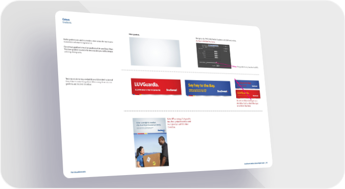 Colors Gradients Silver gradient. Backgrounds: PMS 5455 Radial Gradations 50-55% over white. Available in PANTONE Plus Series Radial gradients are used to provide a clean canvas for text in com- munication and advertising materials. Our primary gradient is the silver gradient which uses Deep Silver. The silver gradient is suitable for text only designs and for designs ustilizing photography Set gradient ramp location to 87%. Text only solutions may use Bold Blue or Warm Red in place of Say hey to the Bay. Deep Silver to make the gradient. When using these colors in 1.6.15 Nonstops to San Francisco (SFO) LUVGuardia. Say hey to the Bay. and Oakland (San Francisco Bay Area) gradients use the silver brand bar. 11.2.14 Nonstops to New York (LaGuardia) 1.6.15 Nonstops to San Francisco (SFO) and Oakland (San Francisco Bay Area) LUVGuardia. 11.2.14 Nonstops to New York (LaGuardia) Do not use Warm Red type on a Bold Blue field, or Bold Blue type on a Warm Red field. . o C s e Note: When using photography ‚irlin t es €outhw ® © the silver gradient must be used When overnight is overdue, ship Next Flight Guaranteed (NFG). in conjunction with the blue With Next Flight Guaranteed(NFG), your Cargo will get where it’s going on brand bar. ® time or your money back. isit swacargo.com or more inormation. The Visual Elements Southwest Airlines Brand Style Guide | 30