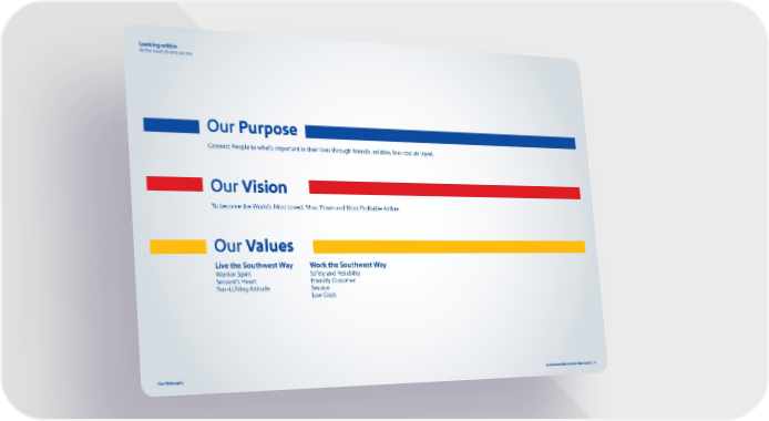 Looking within At the heart of who we are. Our Purpose Connect People to what’s important in their lives through friendly, reliable, low-cost air travel. Our Vision To become the World’s Most Loved, Most Flown and Most Profitable Airline. Our Values Live the Southwest Way Work the Southwest Way Warrior Spirit Safety and Reliability Servant’s Heart Friendly Customer Fun-LUVing Attitude Service Low Costs The Philosophy Southwest Airlines Brand Style Guide | 5