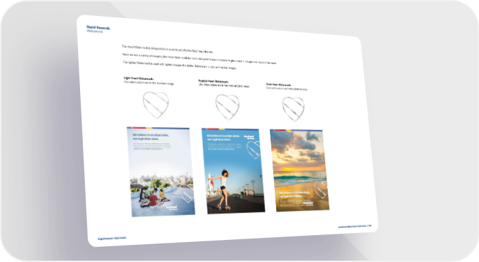 Rapid Rewards Welcome kit The Heart Watermark is designed to be a subtle yet effective branding element. Since we use a variety of imagery, the Heart Watermark has been designed to accommodate its placement in images that have similar tones. The lighter Watermark is used with lighter images, the darker Watermark is used with darker images. Light Heart Watermark: Regular Heart Watermark: Dark Heart Watermark: Use when values are in the medium range. Use when values are in the medium/dark range. Use when values are in the darkest range. We believe in vacation dates, We believe in vacation dates, not expiration dates. not expiration dates. At Southwest Airlines®, we think you should be able to use points how you At Southwest Airlines®, we think you should be able to use points how you want, anytime you want. If you have Rapid Rewards® flight or Partner earning want, anytime you want. If you have Rapid Rewards® flight or Partner earning activity within 24 months, your points won’t expire. Period. That’s Transfarency.® activity within 24 months, your points won’t expire. Period. That’s Transfarency.® Sign up for Rapid Rewards today at Southwest.com/enroll. Sign up for Rapid Rewards today at Southwest.com/enroll. We believe in vacation dates, not expiration dates. At Southwest Airlines®, we think you should be able to use points how you want, anytime you want. If you have Rapid Rewards® flight or Partner earning activity within 24 months, your points won’t expire. Period. That’s Transfarency.® Sign up for Rapid Rewards today at Southwest.com/enroll. ® Rapid Rewards Style Guide Southwest Airlines Brand Style Guide | 108