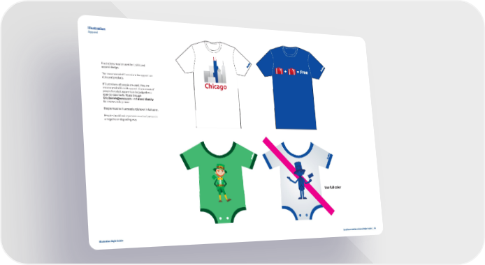 Illustration Apparel Illustrations may be used for t-shirt and apparel design. The recommended illustrations for apparel are cities and products. Chicago If illustrations of people are used, they are recommended for kids apparel. Illustrations of people for adult apparel can be judged on a case-by-case basis. Route through Eric.Daniels@wnco.com and Brand Identity for review and approval. People must be illustrated and shown in full color. People should not represent an actual person in a negative or degrading way. Use full color Illustration Style Guide Southwest Airlines Brand Style Guide | 51