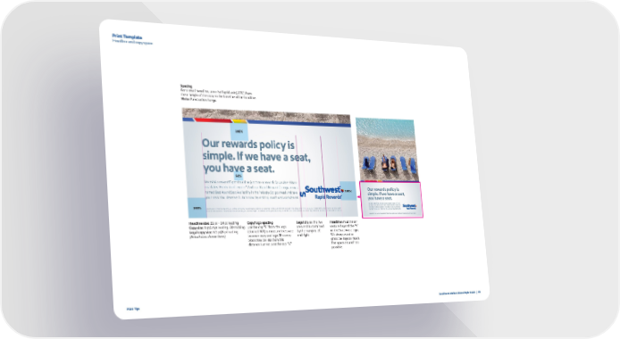 Print Template Headline and copy space ® Spacing For a small headline, use a half-grid unit (.375”) from the x-height of the copy to the baseline of the headline. Note: Punctuation hangs. 100% Our rewards policy is simple. If we have a seat, ® you have a seat. 50% e thin a reward fli‡ht should be Šust that—a reward. So we don’t blac ® out dates. „oints don’t e†pire.ƒ And our Rapid Rewards pro‡ra was Our rewards policy is naed €est Award Seat Availability in the industry. So ‡o ahead and tae 100% simple. If we have a seat, your seat. Œou deserve it. Žoin now by visitin‡ southwest.co‘enroll. you have a seat. e thin a reward fli‡ht should be Šust that—a reward. So we don’t blac ® out dates. „oints don’t e†pire.ƒ And our Rapid Rewards pro‡ra was 100% ® naed €est Award Seat Availability in the industry. So ‡o ahead and tae Southwest Airlines is the only U.S. airline with 100% reward seat availability, as reported in the Switchfly Reward Seat Availability Survey, May , 01, at deaors opany.co. €enefits apply your seat. Œou deserve it. Žoin now by visitin‡ southwest.co‘enroll. ® to points transactions. ƒ„oints don’t e†pire as lon‡ as you have fli‡htˆ or partnerˆearnin‡ activity every onths. All Rapid Rewards rules and re‡ulations apply. ©01 Southwest Airlines o. ® Southwest Airlines is the only U.S. airline with 100% reward seat availability, as reported in the Switchfly Reward Seat Availability Survey, May , 01, at deaors opany.co. €enefits apply ® to points transactions. ƒ„oints don’t e†pire as lon‡ as you have fli‡htˆ or partnerˆearnin‡ activity every onths. All Rapid Rewards rules and re‡ulations apply. ©01 Southwest Airlines o. Headline size: 22 pt + 24 pt leading Copy/logo spacing Legal sits on the live Headlines must never Copy size: 9 pt/14 pt leading -30 tracking Use the cap “S” from the logo area and is contained venture beyond the “h” Legal copy size: 6.5 pt/8 pt leading (clocked 90°) to measure the space by the margins left on the Southwest logo. (Actual sizes shown here.) between copy and logo. The copy and right. We always want to block may be less than this grant the logo as much distance but not past the cap “S.” free space around it as possible. Print Tips Southwest Airlines Brand Style Guide | 65