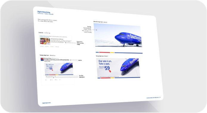 Digital Advertising Paid Social - Twitter / LinkedIn LinkedIn Image Post / 1200x627 When creating ads for Twitter, LinkedIn, etc., please refer to their specs. Padding Avoid placing text or logos near the edge of image due to mobile cropping LinkedIn - Link Sharing Keep text to 150 characters or less Twitter Web Card - Mocked up Twitter Web Card / 800x320 Caption Headline Description Digital Style Guide Southwest Airlines Brand Style Guide | 84