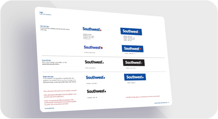 Logo Logo color iterations Full-color logo If color printing is available, use the full-color version of the logo. Southwest_cmyk.ai Southwest_cmyk_rev.ai Southwest_cmyk_News.ai Southwest_cmyk_News_rev.ai Southwest_cmyk_OOH.ai Southwest_cmyk_OOH_rev.ai Southwest_rgb.ai Southwest_rgb_rev.ai Southwest_online_rgb.ai Southwest_online_rgb_rev.ai Grayscale logo When color printing is not available, use the appropriate grayscale artwork. Southwest_grayscale.ai Southwest_grayscale_rev.ai Single-color logo In rare situations, it is impossible to reproduce the color gradient in our symbol. In these rare cases only (e.g., when etching the logo), use the appropriate single-color artwork. Southwest_single_blue.ai Southwest_single_w.ai News—Art prepared with optimal colors for printing on newsprint. OOH—Art prepared with optimal colors for printing on vinyl and other large-format applications. Southwest_single_k.ai Online—Art prepared with different proportions of the Note: When the logo appears on a dark background, use the reversed artwork. wordmark to the Heart Symbol to ensure the best legibility on-screen. This art may only be used online. The Visual Elements Southwest Airlines Brand Style Guide | 27