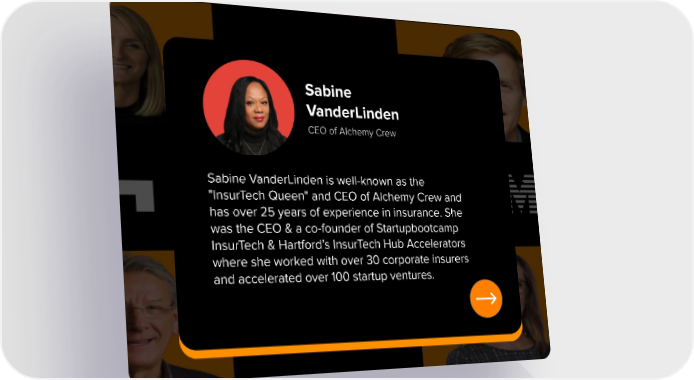 Sabine VanderLinden CEO of Alchemy Crew Sabine VanderLinden is well-known as the "InsurTech Queen" and CEO of Alchemy Crew and has over 25 years of experience in insurance. She was the CEO & a co-founder of Startupbootcamp InsurTech & Hartford’s InsurTech Hub Accelerators where she worked with over 30 corporate insurers and accelerated over 100 startup ventures.
