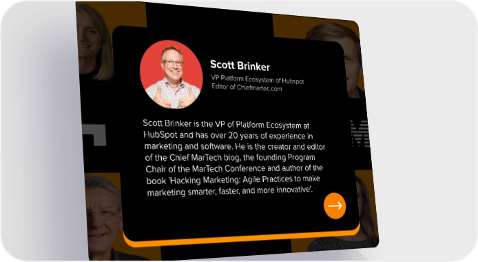 Scott Brinker VP Platform Ecosystem of Hubspot Editor of Chiefmartec.com Scott Brinker is the VP of Platform Ecosystem at HubSpot and has over 20 years of experience in marketing and software. He is the creator and editor of the Chief MarTech blog, the founding Program Chair of the MarTech Conference and author of the book 'Hacking Marketing: Agile Practices to make marketing smarter, faster, and more innovative'.