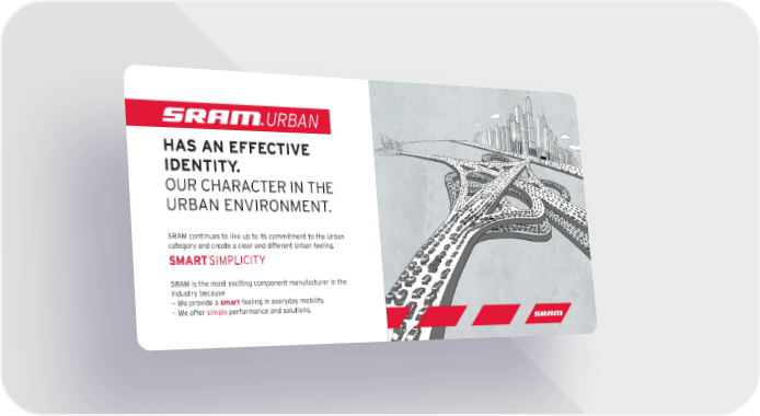 Smart Simplicity URBAN Ha S aN EFFEC tIVE IDENtItY. OUR cHARA ctER iN tHE URBAN ENViRONmENt . SRAm continues to live up to its commitment to the Urban category and create a clear and different Urban feeling. SRAm is the most exciting component manufacturer in the industry because — We provide a smart feeling in everyday mobility. — We offer simple performance and solutions.