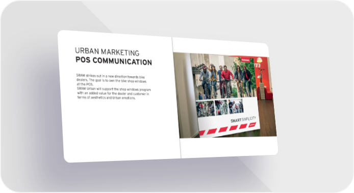 URBAN mARkEtiNG POS COmmUNIC atION SRAm strikes out in a new direction towards bike dealers. t he goal is to own the bike shop windows at the pOS. SRAm Urban will support the shop windows program with an added value for the dealer and customer in terms of aesthetics and Urban emotions.