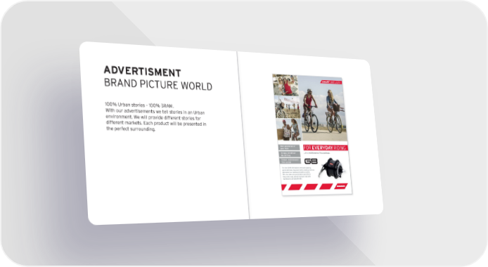 aDVErtISmENt BRAND pictURE WORlD 100% Urban stories – 100% SRAm. With our advertisements we tell stories in an Urban environment. We will provide different stories for different markets. Each product will be presented in the perfect surrounding. New generation of gear hubs Robust, maintenance - free system Snappy, derailleur- like shifting ...in a maintenance-free package. FOR EVEr YD aY RiDiNG Smart Simplicity the new SRAm G8 features even gear spacing, paired with fast, responsive shifts, making a serious alternative to a traditional derailleur system. G8 is for riders who would rather spend their time on the road, without having to deal with maintenance and adjustments.