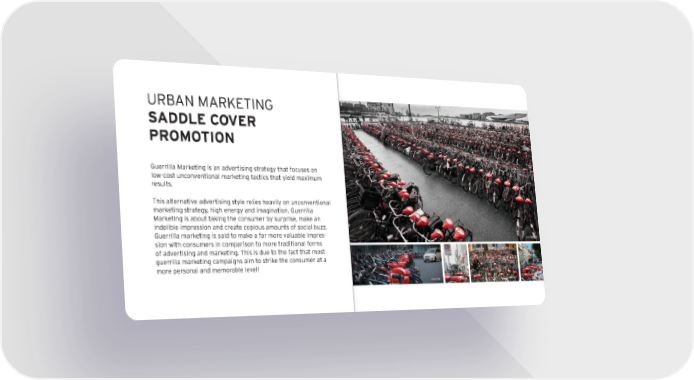 URBAN mARkEtiNG SaDDLE C OVEr PrOmO tION Guerrilla marketing is an advertising strategy that focuses on low-cost unconventional marketing tactics that yield maximum results. this alternative advertising style relies heavily on unconventional marketing strategy, high energy and imagination. Guerrilla marketing is about taking the consumer by surprise, make an indelible impression and create copious amounts of social buzz. Guerrilla marketing is said to make a far more valuable impres - sion with consumers in comparison to more traditional forms of advertising and marketing. t his is due to the fact that most guerrilla marketing campaigns aim to strike the consumer at a more personal and memorable level! MÜNSTER WIEN TaIpEh UTREchT aMSTERdaM