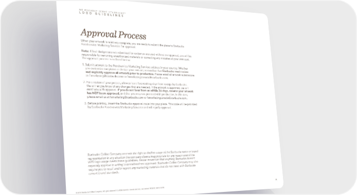 ™ WE PROUDLY SERVE STARBUCKS LOGO GUIDELINES Approval Process When your artwork is relatively complete, you are ready to submit the piece to Starbucks Foodservice Marketing Services for approval. Note: If final designs are not submitted for review or are used without our approval, you will be responsible for removing unauthorized materials or correcting any mistakes at your own cost. The approval process is outlined below: 1. Submit artwork to the Foodservice Marketing Services address in your country. Whether you customize templates or design your own art, remember that Starbucks must review and explicitly approve all artwork prior to production. Please email all artwork submissions to fsmarketing@starbucks.com or fsmarketingcanada@starbucks.com. 2. For a review of your project, allow at least five working days from receipt by Starbucks. We will let you know of any changes that are needed. If the artwork is approved, we will email you with approval. If you do not hear from us within 30 days, assume your artwork has NOT been approved, and that you may not proceed with production. In this case, please email us at fsmarketing@starbucks.com or fsmarketingcanada@starbucks.com. 3. Before printing, insert the Starbucks approval code into your piece. This code will be provided by Starbucks Foodservice Marketing Services and will signify approval. Starbucks Coffee Company reserves the right to decline usage of the Starbucks name or brand representation in any situation the company deems inappropriate for any reason even if the WPS logo usage meets these guidelines. Please remember that anything Starbucks doesn’t expressly approve in writing is considered not approved. Starbucks Coffee Company may also require you to recall and/or reprint any marketing materials that do not meet with Starbucks current brand standards. © 2014 Starbucks Coffee Company. All rights reserved. Confidential—for internal use only. Last revised 11/26/14. SJB14-34174 11