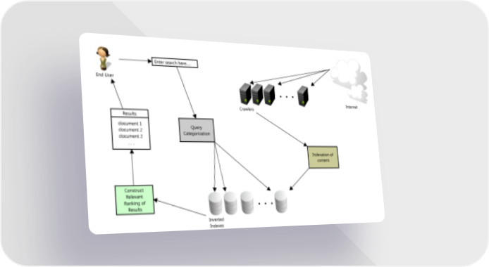 - Organizes the indexed collection and stores alongside corresponding metadata to provide extremely fast and relevant search results (and there are two interesting problems in this step - document classification (http://en.wikipedia.org/wiki/Document_classification) and how to create a performant search engine index (http://en.wikipedia.org/wiki/Index_(search_engine) )