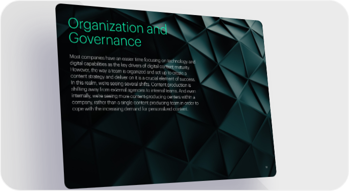 Organization and Governance Most companies have an easier time focusing on technology and digital capabilities as the key drivers of digital content maturity. However, the way a team is organized and set up to create a content strategy and deliver on it is a crucial element of success. In this realm, we’re seeing several shifts. Content production is shifting away from external agencies to internal teams. And even internally, we’re seeing more content-producing centers within a company, rather than a single content producing team in order to cope with the increasing demand for personalized content. 10