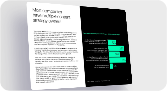 Most companies have multiple content strategy owners The majority of companies have assigned multiple content strategy owners Figure 6: Who is primarily responsible for your digital content strategy? (31%), which means that each function within the organization (e.g. brand, lead gen, product, sales or communications) could have its own content strategy and goals. While this distributed ownership allows for more freedom and experimentation, it also has potential drawbacks. When there An editorial committee, made up of senior are many different content strategies coming from the same company, leaders creates the content strategy that is 15% it may create conflicting objectives within the central content producing implemented by the content team team and a disjointed experience for the customer. A good compromise is a hybrid model where leadership representing the A dedicated content team 29% interests of multiple departments and functions creates a holistic content creates the content strategy, with input strategy, but then allows the content team to own the production based on from multiple departments that strategy. Fifteen percent of companies use this approach. 20% Retail was the only industry where a single department (likely brand) A single department such as the brand, was more likely to be the sole owner of the content strategy. This social or digital marketing team is highlights how digital content is primarily used as a brand builder by retail responsible for the overall content strategy 31% companies. Companies’ responses also varied based on the top content goal they We do not currently have a 5% chose. Respondents who chose brand awareness as their top goal were clear content strategy owner much more likely to have multiple content strategy owners across the organization (40%). In contrast, respondents who used content primarily to generate leads or revenue were more likely to use a dedicated content team setting the content strategy. This indicates that a dedicated content team is more suitable for specific revenue-generating tasks, instead of brand-building content, which can be done by a variety of producers, both internally and externally. SOURCE: Altimeter “The 2021 State of Digital Content” n= 375 11