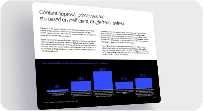 Content approval processes are still based on inefficient, single item reviews The results of this question highlight one of the biggest barriers to producing Increasingly, companies are using better tools for approval. Sixteen-percent content at scale. Inefficient review and compliance processes slow down are using a dedicated compliance platform which streamlines the approval content output and make it difficult for the content to be re-used or tweaked for process and allows for quicker review. And 23% are using a “modular” content personalization across different functions. approval system, where small portions of content are sent for approval, and then recombined in different ways for personalization at scale. This allows creators to A great majority of companies (39%) are still getting content approved the old- bypass having to send every variation for review again. fashioned way, by sending each piece individually through a cycle of review from multiple stakeholders (e.g. executives or legal teams.) While this is may be Despite the progress, this is an area where even the more digitally mature thorough, it becomes a major roadblock when large amounts of content must industries such as banking, retail and technology are lagging. It shows that be produced, or if each variation of a content personalization scheme as to be improving the review system isn’t just a matter of getting good at technology individually approved. (which these industries have done) but overcoming embedded processes and mindsets to embrace innovative practices. Figure 16: How would you describe your current content approval process for compliance? SOURCE: Altimeter “The 2021 State of Digital Content” n= 375 24
