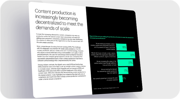 Content production is increasingly becoming decentralized to meet the demands of scale To meet the increasing demand for content, companies can ramp up Figure 8: How are you scaling the production of content to meet the demand for production within the central content team using better software and increased personalization? adding more personnel. Conversely, companies can also start distributing the creation to other parts of the organization so that the central team isn’t the sole creator anymore. We are setting up multiple content creation centers and using better processes Most companies are choosing the latter strategy (32%). The challenge and AI-powered software to automate 18% with this approach is to maintain the quality and consistency of all the content creation content produced, and tie it under some sort of unified strategy. However, with digital tools and skills becoming more available to all types of teams We are setting up multiple content creation and departments, the case for centralizing content production becomes centers within the organization dedicated to 32% harder once the company grows beyond a certain size. Companies that different products, regions or functions successfully decentralize much of their content production must have a coherent unified strategy that is implemented by the center. We are increasing the output of the Among industry verticals, the digitally savvy retail (41%) and technology central content team through additional 27% (29%) industries were more likely to set up multiple content creation centers hires and better software to increase output, whereas digital laggards such as insurance (29%) and healthcare (44%) were more likely to up the headcount of the central We are meeting the demand content team. While this indicates that decentralizing content production is by outsourcing content production 17% the mature solution, it also highlights how industries that deal with a lot of (e.g. to an agency) compliance are much more likely to keep content production centralized in order to better ensure compliance. Not currently planning to increase the scale 6% of content creations SOURCE: Altimeter “The 2021 State of Digital Content” n= 375 13