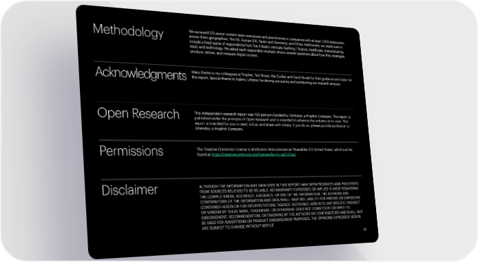 We surveyed 375 senior content team executives and practitioners in companies with at least 1,000 employees, Methodology across three geographies, The US, Europe (UK, Spain and Germany), and China. Additionally, we made sure to include a fixed quota of respondents from five industry verticals: banking / finance, healthcare, manufacturing, retail, and technology. We asked each respondent multiple choice answer questions about how they strategize, produce, deliver, and measure digital content. Many thanks to my colleagues at Prophet, Ted Moser, Mat Zucker and David Novak for their guidance and vision for Acknowledgments this report. Special thanks to Aubrey Littleton for driving our survey and conducting our research analysis. Open Research This independent research report was 100 percent funded by Altimeter, a Prophet Company. This report is published under the principle of Open Research and is intended to advance the industry at no cost. This report is intended for you to read, utilize, and share with others; if you do so, please provide attribution to Altimeter, a Prophet Company. Permissions The Creative Commons License is Attribution-Noncommercial ShareAlike 3.0 United States, which can be found at https://creativecommons.org/licenses/by-nc-sa/3.0/us/. Disclaimer ALTHOUGH THE INFORMATION AND DATA USED IN THIS REPORT HAVE BEEN PRODUCED AND PROCESSED FROM SOURCES BELIEVED TO BE RELIABLE, NO WARRANTY EXPRESSED OR IMPLIED IS MADE REGARDING THE COMPLETENESS, ACCURACY, ADEQUACY, OR USE OF THE INFORMATION. THE AUTHORS AND CONTRIBUTORS OF THE INFORMATION AND DATA SHALL HAVE NO LIABILITY FOR ERRORS OR OMISSIONS CONTAINED HEREIN OR FOR INTERPRETATIONS THEREOF. REFERENCE HEREIN TO ANY SPECIFIC PRODUCT OR VENDOR BY TRADE NAME, TRADEMARK, OR OTHERWISE DOES NOT CONSTITUTE OR IMPLY ITS ENDORSEMENT, RECOMMENDATION, OR FAVORING BY THE AUTHORS OR CONTRIBUTORS AND SHALL NOT BE USED FOR ADVERTISING OR PRODUCT ENDORSEMENT PURPOSES. THE OPINIONS EXPRESSED HEREIN ARE SUBJECT TO CHANGE WITHOUT NOTICE 29