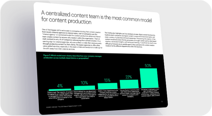 A centralized content team is the most common model for content production One of the biggest shifts we’ve seen is companies moving their content creation This finding also highlights just how strategic an asset digital content has become. from mostly external agencies to internal teams. Half of companies use this Sophisticated companies use digital content to serve multi-functional teams, and “internal agency” or centralized model for content production where an internal meet a variety of goals beyond brand awareness. Outsourcing the creation of that team creates content for anyone who needs it within the organization. That’s in content would slow down the key processes of an agile system such as data-based stark contrast to only 4% of companies outsourcing their content creation. It’s a creation, automated insights, and testing and learning. It would also be much more warning sign for creative agencies, who are unlikely to make their revenue purely difficult to find and vet an outside agency that could serve the content creation through producing content for their clients. We expect agencies to offer other needs of all the different departments within the business. value-added services, especially in the realm of data and analytics to make up for the shift away from their creative services. Figure 7: Which model most closely describes how your company manages production across multiple departments or geographies? SOURCE: Altimeter “The 2021 State of Digital Content” n= 375 12