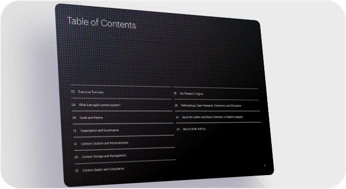Table of Contents 03 Executive Summary 25 Key Research Insights 04 What is an agile content system? 29 Methodology, Open Research, Permission, and Disclaimer 06 Goals and Metrics 30 About the Author and About Altimeter, a Prophet company 10 Organization and Governance 30 How to Work With us 14 Content Creation and Personalization 20 Content Storage and Management 22 Content Quality and Compliance 2