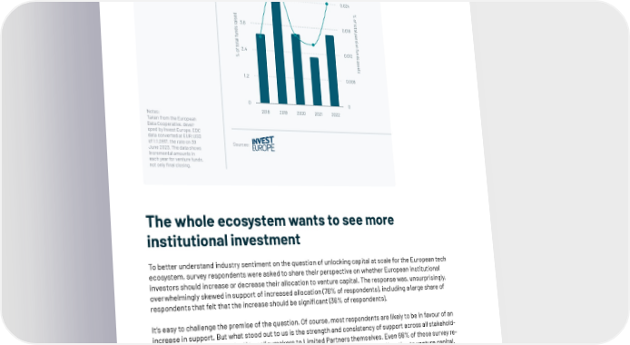 European pension funds committed to VC funds as a share of total funds raised and total European pension funds assets (%) per year, 2018 to 2022 % of total funds raised % of total pension funds assets 6 0.03 4.8 0.024 % o f d t e o t s a i l a3.6 0.018 r p e s n d s n i u o f n l a f t u o n t d s f2.4 0.012 o a s % s e t s 1.2 0.006 0 0 Notes: 2018 2019 2020 2021 2022 Taken from the European Data Cooperative, devel- oped by Invest Europe. EDC data converted at EUR:USD of 1:1.0917, the rate on 30 Sources: June 2023. The data shows incremental amounts in each year for venture funds, not only final closing. The whole ecosystem wants to see more institutional investment To better understand industry sentiment on the question of unlocking capital at scale for the European tech ecosystem, survey respondents were asked to share their perspective on whether European institutional investors should increase or decrease their allocation to venture capital. The response was, unsurprisingly, overwhelmingly skewed in support of increased allocation (76% of respondents), including a large share of respondents that felt that the increase should be signi昀椀cant (36% of respondents). It’s easy to challenge the premise of the question. Of course, most respondents are likely to be in favour of an increase in support. But what stood out to us is the strength and consistency of support across all stakehold- er groups, from VCs (surprise!) to policymakers to Limited Partners themselves. Even 66% of those survey re- spondents working outside of the tech sector perceived the need for increased allocation to venture capital. The survey registers a strong call to action. 213 | Fundraising