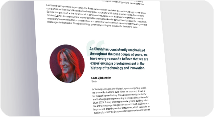 First and foremost, there are multiple reasons for remaining optimistic about the current opportunities for founders. As outlined in this report, the funding landscape in Europe remains on an upward trajectory from a long-term perspective, and the European startup ecosystem continues to attract investors from all parts of the world. Hence, it appears that the downturn is a temporary market correction rather than a lasting threat to the European startup ecosystem. Secondly, the adjusted market reality has raised the bar for aspiring founders: Only companies genuinely dedicated to solving the world’s most pressing problems will thrive. The emphasis has shifted from explosive growth and quick returns to building enduring companies. Founders must prepare themselves for the long haul, driven by a sense of purpose and mission, which in the long run, could bring positive outcomes for the European ecosystem. Lastly and perhaps most importantly, the European ecosystem has taken the lead in building purpose-driven companies, with sectors like carbon and energy accounting for a third of all invested capital. Furthermore, Europe has put itself at the forefront of AI ethics and regulation amid the breakthrough of large language models (LLMs). In a world where technological innovation is driven by competition, it is essential to establish regulatory frameworks that promote ethics and safety. Europe has already taken the lead in tackling societal challenges in the 昀椀eld of AI and technology, potentially setting the standard for decades to come. As Slush has consistently emphasized throughout the past couple of years, we have every reason to believe that we are experiencing a pivotal moment in the history of technology and innovation. Linda Björkenheim Slush In 昀椀elds spanning energy, biotech, space, computing, and AI, we are suddenly able to build things we could only dream of for most of human history. This unprecedented potential for world-changing entrepreneurship is re昀氀ected in our theme for Slush 2023: A story of entrepreneurial grit and building to last. We are witnessing a rising ecosystem with Slush 2023 attract- ing a record-breaking number of founders, which speaks for an exciting future in the European startup ecosystem and beyond. | 18
