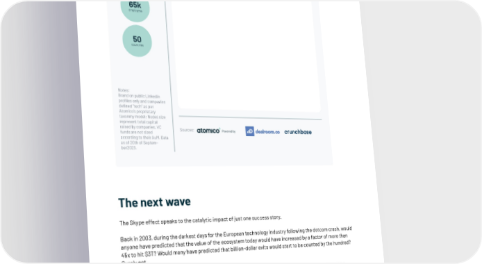 Skype network visualised 950 companies 65k employess 50 countries Notes: Brand on public Linkedin profiles only and companies defined “tech” as per Atomico’s proprietary taxonmy model; Nodes size represent total capital raised by companies, VC Sources: Powered by funds are not sized according to their AuM. Data as of 20th of Septem- ber2023. The next wave The Skype effect speaks to the catalytic impact of just one success story. Back in 2003, during the darkest days for the European technology industry following the dotcom crash, would anyone have predicted that the value of the ecosystem today would have increased by a factor of more than 45x to hit $3T? Would many have predicted that billion-dollar exits would start to be counted by the hundred? Surely not. And yet, in just the past 昀椀ve years alone, there have been a remarkable 111 billion-dollar exits of European tech companies. This is a huge number, but it is also just the start. Europe’s never had a stronger pipeline of billion-dollar exit candidates. This also underlines why it’s so critical for the ecosystem to see a return to a healthy and functioning exit mar- ket, both in the form of entry to public markets, as well as through M&A. | 62