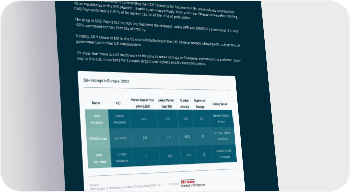 Class of 2023 $B+ IPOs receive mixed welcome Despite the general quiet of the public markets, Europe still managed to record a total of three billion-dollar market cap tech IPOs in 2023, capped off by ARM’s massive $55B IPO in Q3 2023. Whether or not ARM represented the start of a long-awaited set of market ‘re-openers’ is yet to be seen. The relatively 昀氀at post-IPO performance of ARM’s share price is likely to give food for thought to some candidates until a clearer sense of price stability is established. The self-in昀氀icted challenges surrounding the CAB Payments listing, meanwhile, are less likely to embolden other candidates in the IPO pipeline. Thanks to an unexpectedly stark pro昀椀t warning just weeks after IPO-ing, CAB Payments has lost 81% of its market cap, as of the time of publication. The drop in CAB Payments’ market cap has been the steepest, while ARM and IONOS are standing at -5% and -30% compared to their 昀椀rst day of trading. Notably, ARM chose to list in the US over a local listing in the UK, despite intense lobbying efforts from the UK government and other UK stakeholders. It’s clear that there is still much work to be done to make listings on European exchanges the preferred gate- way to the public markets for Europe’s largest and highest-pro昀椀le tech companies. $B+ listings in Europe, 2023 Market Cap at first Latest Market % price Quarter of Name HQ pricing ($B) Cap ($B) change listings Listing Venue Arm United Nasdaq Global Holdings Kingdom 54.5 51.8 -5% Q3 Select XETRA Trading IONOS Group Germany 2.8 1.8 -30% Q1 Platform CAB United London Stock Payments Kingdom 1 0.2 -81% Q2 Exchange Notes: S&P Capital IQ Platform, as of date 30 September 2023, for Sources: illustrative purposes only. | 238