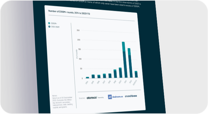 Mega-round momentum drops The combination of the withdrawal of crossover investors and the general slowdown in late-stage investment activity is unsurprisingly re昀氀ected in a huge decline in the number of so-called mega-rounds, meaning round sizes of $100M or more. In the peak of 2021, there were almost 200 rounds of this magnitude, including more than 50 rounds greater than $250M. While this number declined slightly in 2022 to 163 rounds of $100M or more (of which 38 were greater than $250M), the 昀椀rst nine months of 2023 saw a far more signi昀椀cant decrease. In the 昀椀rst nine months of 2023 to date, there have been 36 rounds of $100M or more, of which only seven have been sized in excess of $250M. Number of $100M+ rounds, 2014 to 2023YTD $250M+ $100-250M 250 200 s 150 d n u o r f o # 100 50 0 4 5 6 7 8 9 0 1 2 D 1 1 1 1 1 1 2 2 2 T 0 0 0 20 0 0 0 0 0 Y 2 2 2 2 2 2 2 2 3 2 20 Notes: Data is as of 30 September Sources: Powered by 2023. Excludes the follow- ing: biotech, secondary transactions, debt, lending capital, and grants. 77 | Companies