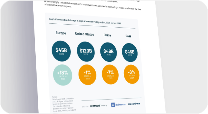 It’s a global phenomenon Of course, the market reset isn’t solely a European concern: it’s a worldwide phenomenon. There has been a notably consistent reduction in global private tech investment not only in Europe, but also in the US, China, and beyond. However zooming out a few years, Europe has continued on an upward trajectory and is on track to raise 18% more compared to 2020. We are the only region globally where long term growth has not 昀氀attened out. Mean- while US, China and Rest of World are on track to land 昀氀at or below 2020 昀椀gures. Unsurprisingly, this global retraction in total investment volumes is also having a knock-on effect on the 昀氀ow of capital between regions. Capital invested and chnage in capital invested (%) by region, 2020 versus 2023 Europe United States China RoW $45B $120B $48B $45B 2023E 2023E 2023E 2023E +18% -1% -7% -8% 2023E vs 2023E vs 2023E vs 2023E vs 2020 2020 2020 2020 Notes: Data is as of 30th September 2023. Full year extrapolated based on year to date data. Excludes the following: biotech, secondary transac- Sources: Powered by tions, dept, lending capital and grants. 23 | Executive summary