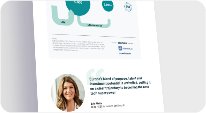 Snapshot of unique companies headquartered in Europe by stage Early stage companies Growth stage companies $1B companies Notes: Data as of 30Sep 2023. Based on historial analysis of conversion rates: 15% Sources: Powered by of Seed stage companies convert A on average and 33% of Series A convert to Series B(for the majority of those converting, it takes place within 2 years); these rates have been applied to the current cohort of Seed and Early stage companies for illustrative perposes. Europe’s blend of purpose, talent and investment potential is unrivalled, putting it on a clear trajectory to becoming the next tech superpower. Erin Platts CEO, HSBC Innovation Banking UK Startup creation in Europe outpaces any region and we expect the breadth and depth of this activity to grow, with 25,000 more in the next 昀椀ve years. What sets us apart is not only the pace of growth – it’s local investors stepping up to support mission-driven founders that bring together the best and brightest to solve critical challenges. Sustainability and climate in particular have been at the heart of the European ecosystem, with the Energy & Carbon sector attracting the most VC investment this year alone. The rise in funding for growth stage companies and the potential for more IPOs in 2024 also sets the scene for a maturing tech ecosystem in Europe, unlocking more pathways to growth for purpose-driven founders. | 56