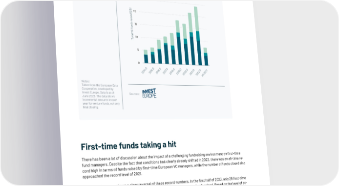 Overall VC funds raised ($B) by fund type per year, 2014 to H1 2023 Early-stage Later stage venture 30 Venture (all stages) 25 ) B20 $ ( d e s i a r s d 15 n u f C V l a t 10 o T 5 0 0 0 0 0 0 0 0 0 0 3 . . . . . . . 1. . 2 4 5 6 7 8 9 0 2 1 1 1 1 1 1 2 2 2 0 0 0 0 20 0 0 0 0 0 2 2 2 2 2 2 2 2 2 H1 Notes: Taken from the European Data Cooperative, developed by Invest Europe. Data is as of Sources: June 2023. The data shows incremental amounts in each year for venture funds, not only final closing. First-time funds taking a hit There has been a lot of discussion about the impact of a challenging fundraising environment on 昀椀rst-time fund managers. Despite the fact that conditions had clearly already shifted in 2022, there was an all-time re- cord high in terms of funds raised by 昀椀rst-time European VC managers, while the number of funds closed also approached the record level of 2021. This year, however, shows a clear reversal of these record numbers. In the 昀椀rst half of 2023, only 29 昀椀rst-time European VC funds were closed for a total of less than $1B in aggregate funds raised. Based on the level of ac- tivity seen year to date, it’s clear that the full-year total will fall well short of recent highs and look set to drop back to levels last seen in pre-Covid years. | 196