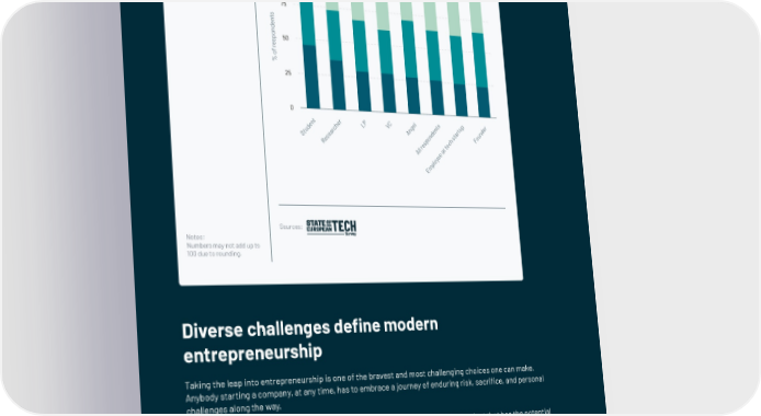 How attractive do you think it is to become a founder of a European tech company now compared to 12 months ago? Less attractive 100 About the same More attractive 75 s t n e d n o p 50 s e r f o % 25 0 t r P C l s p r n e L V ge nt u e e h n e rt d d c n u r A d a u t a n t o S e o s F s p h e s c R e e r t l t l a A e e y lo p m E Sources: Notes: Numbers may not add up to 100 due to rounding. Diverse challenges de昀椀ne modern entrepreneurship Taking the leap into entrepreneurship is one of the bravest and most challenging choices one can make. Anybody starting a company, at any time, has to embrace a journey of enduring risk, sacri昀椀ce, and personal challenges along the way. That is why it’s essential to remove barriers to entrepreneurship to unlock latent talent that has the potential to succeed. To explore this, we asked survey respondents this year to share their perceptions of the greatest barriers for founders looking to start a company in Europe today. The top responses are a lack of access to external 昀椀nancing (59%) and personal 昀椀nancial constraints (48%), followed by the uncertainty created by the macro backdrop (43%). This aligns with 昀椀ndings explored else- | 170