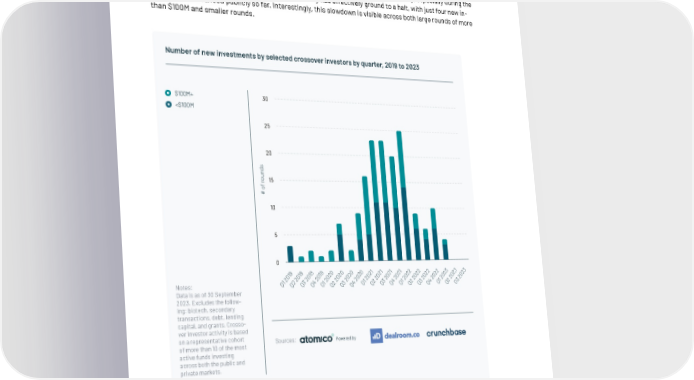 Crossover investor activity grinds to a halt As highlighted in the ‘First Look’ midyear update to the State of European Tech, a consequence of a very dif- ferent exit landscape has been a huge decrease in - and in some cases a complete withdrawal from - activity by so-called ‘crossover investors.’ The retreat of these funds that actively invest across both the public and private markets has been a major factor in the slowdown of late-stage and large-round investment activity. In 2022, the volume of new investment activity had already started to slow dramatically, especially during the second half of the year. This year, investment activity has effectively ground to a halt, with just four new in- vestments announced publicly so far. Interestingly, this slowdown is visible across both large rounds of more than $100M and smaller rounds. Number of new investments by selected crossover investors by quarter, 2019 to 2023 $100M+ 30