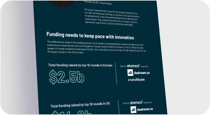 In this new era, the challenge for us was about choosing the right partnerships, because it’s about more than just money. Jonas Andrulis Founder & CEO, Aleph Alpha Of course, someone has to pay for the compute and all the tal- ent. But the thing that will help us survive in the upper echelons of generative AI is also the partnerships and our partners are phenomenal. They understand that this is a unique, once in a generation opportunity to build something meaningful. Funding needs to keep pace with innovation The difference in scale of the funding going to US AI leaders is emphasised by a simple comparison of the total amount raised across the top 10 largest AI rounds raised in 2023 in Europe vs. the US. While Europe’s largest AI rounds totalled an impressive $2.5B, this is dwarfed by the more than $14.2B raised across the top 10 largest rounds in the US this year. Total funding raised by top 10 rounds in Europe Source Powered by $2.5b Total funding raised by top 10 rounds in US Source Powered by $14.2b 147 | Companies