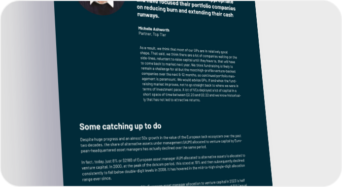 For the most part, established VCs have done a good job of managing their portfolios over the past 12-18 months. They’ve taken signi昀椀cant write downs where appropriate and have focused their portfolio companies on reducing burn and extending their cash runways. Michelle Ashworth Partner, Top Tier As a result, we think that most of our GPs are in relatively good shape. That said, we think there are a lot of companies waiting on the side-lines, reluctant to raise capital until they have to, that will have to come back to market next year. We think fundraising is likely to remain a challenge for all but the most high-pro昀椀le venture-backed companies over the next 6-12 months, so continued portfolio man- agement is paramount. We would advise GPs, if and when the fund- raising market improves, not to go straight back to where we were in terms of investment pace. A lot of VCs deployed a lot of capital in a short space of time between Q2.20 and Q2.22 and we know historical- ly that has not led to attractive returns. Some catching up to do Despite huge progress and an almost 50x growth in the value of the European tech ecosystem over the past two decades, the share of alternative assets under management (AUM) allocated to venture capital by Euro- pean-headquartered asset managers has actually declined over the same period. In fact, today, just 8% or $218B of European asset manager AUM allocated to alternative assets is allocated to venture capital. In 2000, at the peak of the dotcom period, this stood at 19% and then subsequently declined consistently to fall below double-digit levels in 2008. It has hovered in the mid-to-high single-digit allocation range ever since. To put this in a broader context, at 8%, European asset manager allocation to venture capital in 2023 is half of the US average of 16% (equivalent of $1,100B) and signi昀椀cantly lower than the global average of 21% (equal to $2,776B). For the US as well as global AUM allocation, the share held by VC has risen steadily over the last decade since hitting lows of 10-11% in 2013. 199 | Fundraising
