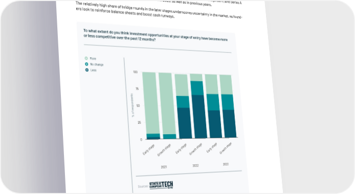 Investors back in the game In last year’s State of European Tech report, a clear uptick in bridge rounds was already becoming evident by Q2 2022. Today, that uptick has developed into a clear trend, with 2023 seeing the highest share of bridge rounds across all stages globally since 2019. Bridge rounds are more common at the earliest stages of a startup’s fundraising journey, when they serve to buy more time to 昀椀nd product-market 昀椀t. This is also re昀氀ected in the data, with Seed stage (38%) and Series A (39%) seeing the highest share of extension rounds in 2023, as well as in previous years. The relatively high share of bridge rounds in the later stages underscores uncertainty in the market, as found- ers look to reinforce balance sheets and boost cash runways. To what extent do you think investment opportunities at your stage of entry have become more or less competitive over the past 12 months? More No change Less 100 75 s t n e d n o p 50 s e r f o % 25 0 ge ge ge ge ge ge a a a a a a t t t t t t s s s s s s y h y h y h l t l t l t r r r a w a w a w E o E o E o r r r G G G 2021 2022 2023 Sources: Notes: VC respondents only. Numbers may not add up to 100 due to rounding. 93 | Companies