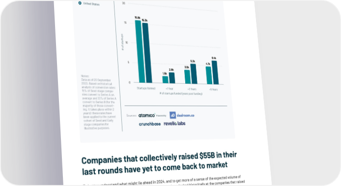 This underlines the imperative for the European tech ecosystem to ensure that funding 昀氀ows to European tal- ent, giving them the 昀椀repower to compete globally and ensuring Europe can play a meaningful role in shaping the future. Number of new $1B+ European tech companies by year, 2014 to 2023YTD Europe 20 United States 15.8k 15.3k 15 s p u t r a t 10 s f o # 6.4k 5.3k 4.7k 5 3.6k 2.8k 1.8k Notes: Data as of 20 September 0 2023. Based on historical analysis of conversion rates: Startups formed +1 Year +3 Years +5 Years 15% of Seed stage compa- # of startups funded (years post funding) nies convert to Series A on average and 33% of Series A convert to Series B (for the majority of those convert- ing, it takes place within 2 years); these rates have Sources: been applied to the current Powered by cohort of Seed and Early stage companies for illustrative purposes. Companies that collectively raised $55B in their last rounds have yet to come back to market To better understand what might lie ahead in 2024, and to get more of a sense of the expected volume of companies that will need to raise capital next year, we have looked historically at the companies that raised rounds in each year, and mapped out whether they went on to raise an additional round of investment. Typically, 80% of companies that raised a funding round in any given year subsequently go on to raise another round of funding, whether those rounds are larger, 昀氀at, smaller, or of an undisclosed size. Looking back at the rounds that were raised in the peak years of 2021 and 2022, there is clearly still a large overhang in terms of companies that have not yet raised subsequent rounds, at least as far as what’s been 103 | Companies