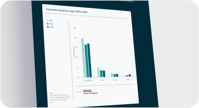 US dominates global public tech market cap Global markets are showing signs of stabilisation. With the exception of China, all global regions have seen some recovery in public market values since the 2021 peak. The United States continues to dominate, capturing 70% of the global market cap at $17T. At just $1.4T in total market cap, Europe captures only a mid-single-digit percentage (6%) of the total public market capitalisation of global technology companies, despite capturing four positions within the top 10 countries by tech market cap. Total market cap ($T) per region, 2021 to 2023 2021 2022 2023 25 20 ) T 15 $ ( p a c t e k r a 10 M 5 0 United States China Europe RoW Notes: Sources: S&P Capital IQ Platform, as of date 30 September 2023, for illustrative purposes only. | 240