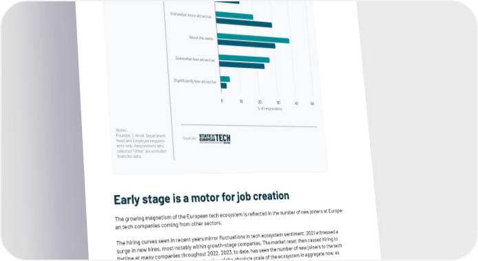 How attractive do you think it is to work for a European tech company, specifically at the stage your startup is at now, compared to 12 months ago? 2023 2022 Significantly more attractive Powered by Somewhat more attractive About the same Somewhat less attractive Significantly less attractive 0 10 20 30 40 50 % of respondents Notes: Founder, C-level, Department Sources: head and Employee respond- ents only. Respondents who selected "Other" are excluded from the data. Early stage is a motor for job creation The growing magnetism of the European tech ecosystem is re昀氀ected in the number of new joiners at Europe- an tech companies coming from other sectors. The hiring curves seen in recent years mirror 昀氀uctuations in tech ecosystem sentiment. 2021 witnessed a surge in new hires, most notably within growth-stage companies. The market reset then caused hiring to 昀氀atline at many companies throughout 2022. 2023, to date, has seen the number of new joiners to the tech industry grow in record volumes, a re昀氀ection of the absolute scale of the ecosystem in aggregate now, as opposed to a dramatic acceleration of growth at the individual company level. Perhaps the most surprising data here, however, is the difference in the absolute volume of new joiners between early-stage and late-stage companies. While growth-stage scale ups are important contributors to | 166