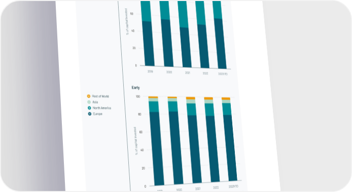 Capital invested in Europe by geographic source region (%), 2019 to 2023 Growth Rest of World 100 Asia North America Europe 80 d e t s 60 e v n i l a t i p a c f 40 o % 20 0 2019 2020 2021 2022 2023YTD Early Rest of World 100 Asia North America Europe 80 d e t s 60 e v n i l a t i p a c f 40 o % 20 0 Notes: 2019 2020 2021 2022 2023YTD Data is as of 30 September 2023. Excludes the follow- ing: biotech, secondary transactions, debt, lending Sources: capital, and grants. | 120