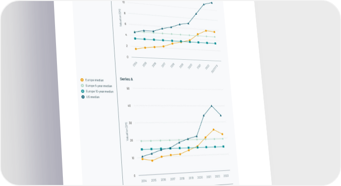 Median pre-money valuation ($M) by stage, 2014 to 2023 Europe median Seed Europe 5-year median Europe 10-year median 14 US median 12 10 ) M $ 8 ( n o i t a u l 6 a V 4 2 0 4 5 6 7 8 9 0 1 2 D 1 1 1 1 1 1 2 2 2 T 0 0 0 0 0 0 0 0 0 Y 2 2 2 2 2 2 2 2 2 3 2 0 2 Europe median Series A Europe 5-year median 50 Europe 10-year median US median 40 )30 M $ ( n o i t a u l a V20 10 0 2014 2015 2016 2017 2018 2019 2020 2021 2022 2023 Notes: Data is as of 30 September 2023. Sources: Excluded biotech & pharma firms. 91 | Companies