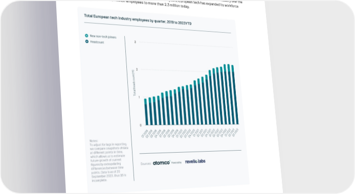 Tech continues its pull on talent Even in the face of challenges in the capital markets and concerning indicators such as layoffs, European tech is not losing its strong appeal to talent and is not seeing any type of mass exodus of talent out of the indus- try. In fact, new positions are constantly being created, and the brightest and best talent continues to place signi昀椀cant bets on the European tech sector. Although there has been a levelling off in the rate of increase of net new joiners into the tech industry over the past three quarters, it’s remarkable that in just 昀椀ve short years, European tech has expanded its workforce from slightly over one million employees to more than 2.3 million today. Total European tech industry employees by quarter, 2019 to 2023YTD New non-tech joiners Headcount 3 ) 2 M ( t n u o c d a e h l a t o T 1 0 8 8 8 8 9 9 9 9 0 0 0 0 1 1 1 1 2 2 2 2 3 3 3 1 1 1 1 1 1 1 1 2 2 2 2 2 2 2 2 2 2 2 2 2 2 2 0 0 0 0 0 0 0 0 0 0 0 0 0 0 0 0 0 0 0 0 0 0 0 2 2 2 2 2 2 2 2 2 2 2 2 2 2 2 2 2 2 2 2 2 2 2 1 2 3 4 1 2 3 4 1 2 3 4 1 1 Q Q 1 2 3 4 Q 2 3 4 2 3 Q Q Q Q Q Q Q Q Q Q Q Q Q Q Q Q Q Q Q Notes: Q To adjust for lags in reporting, we compare snapshots of data at different points in time, which allows us to estimate future growth of current figures by extrapolating Sources: Powered by differences between time points. Data is as of 20 September 2023, thus Q3 is incomplete. | 164