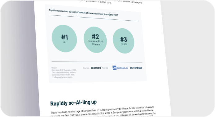 AI innovation wave ignites Europe’s Seed scene Looking more closely at the most popular sectors at the earliest stages, we see other key trends starting to take off as well for Seed investments. Not surprisingly, the most notable one is the rise of AI, with a huge number of companies popping up to capitalise on the wave of innovation ignited by breakthroughs in large language models (LLMs). This has catapulted AI/ML to the top of the charts as the number one earliest-stage category, as ranked by the count of rounds of investment of $5M or less. Though things are certainly incredibly active at the earliest stages in AI, Europe already has a growing and maturing ecosystem of growth stage companies with AI at their core. Top themes ranked by capital invested for rounds of less than