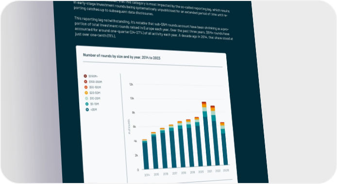 Round volumes trending back to pre-2021 levels The slowdown in investment activity is re昀氀ected in a decreased count of disclosed investment rounds. Look- ing at the investment activity across the last ten years, 2021 and 2022 are standout years, while 2023 is on track to land in line with prior years. The category of rounds involving investment amounts of $5M or less continue to represent the overwhelming majority of all activity, equating to 73% of all rounds in 2023. It should be noted, however, that this category is most impacted by the so-called reporting lag, which results in early-stage investment rounds being systematically unpublicised for an extended period of time until re- porting catches up to subsequent data disclosures. This reporting lag notwithstanding, it’s notable that sub-$5M rounds account have been shrinking as a pro- portion of total investment rounds raised in Europe each year. Over the past three years, $5M+ rounds have accounted for around one-quarter (24-27%) of all activity each year. A decade ago in 2014, that share stood at just over one-tenth (11%). Number of rounds by size and by year, 2014 to 2023 $250M+ $100-250M 12k $50-100M $20-50M $10-20M 10k $5-10M