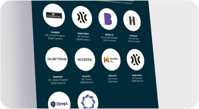 A selection of Europe’s largest AI rounds of 2023 The rank of the largest rounds raised by European AI companies in 2023 highlights the strength of investor interest in supporting the up-and-coming generation of potential European AI champions. Notably, this list includes three rounds in excess of half a billion dollars each, including German foundational model company, Aleph Alpha’s most recent $500M Series C round. The list is also notable for the presence of both ‘pure’ AI companies, such as Mistral and Aleph Alpha, as well as ‘applied AI’ companies that are bringing AI innovation to industries as diverse as defence (Helsing AI) and mobility (Conigital). The question to ask now is when will Europe start to see billion-dollar rounds that match the scale of capital being invested into US AI leaders? Conigital Aleph Alpha Builder.ai Helsing AI HQ: United Kingdom HQ: Germany HQ: United Kingdom HQ: Germany $528M Series A $500M Series C $250M Series D $222M Series B Powered by Quantexa Accenta Mistral AI Aleph Alpha HQ: United Kingdom HQ: France HQ: France HQ: Germany $129M Series E $116M Series A $113M Seed $108M Series B Powered by DeepL Synthesia HQ: Germany HQ: United Kingdom $100M Series B $89M Series C | 148