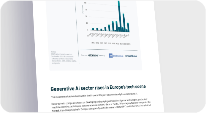 Number of $100M+ rounds in AI / ML, 2014 to 2023 $1B+ $250M-$1B 150 $100M-$250M 125 100 s d n u o 75 r f o # 50 25 0 e S e S e S e S e S e S e S e S e S e S p U p U p U p U p U p U p U p U p U p U o o o o o o o o o o ur ur ur ur ur ur ur ur ur ur E E E E E E E E E E 2014 2015 2016 2017 2018 2019 2020 2021 2022 2023 Notes: 2023 data is based on data to Sources: Powered by September 2023. Excludes the following: biotech, secondary transactions, debt, lending capital, and grants. Generative AI sector rises in Europe’s tech scene The most remarkable subset within the AI space this year has undoubtedly been Generative AI. Generative AI companies focus on developing and applying arti昀椀cial intelligence technologies, particularly machine learning techniques, to generate new content, data, or media. This category features companies like Mistral AI and Aleph Alpha in Europe, alongside OpenAI (the makers of ChatGPT) and In昀氀ection AI in the United States. While Generative AI companies may represent a relatively small fraction of overall tech fundraising activity on an absolute count basis, they have swiftly had an outsized impact on work昀氀ows, regulatory discourse, and society at large. | 52