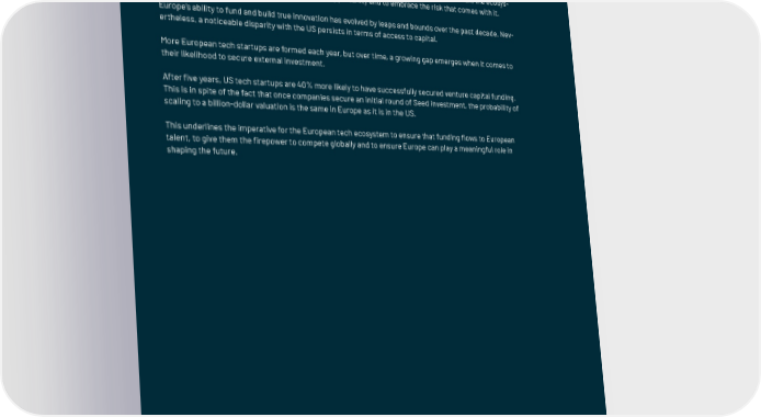 Europe’s tech startup boom meets funding bottleneck Europe is seeing more new tech startups being formed than any other region, supported by the strongest ever teams working on the most challenging and urgent problems. Europe has all the essential raw ingredi- ents to become the next tech superpower. But for Europe to be able to shape the future of tech, the ecosys- tem needs to take further action to embrace the opportunity and to embrace the risk that comes with it. Europe’s ability to fund and build true innovation has evolved by leaps and bounds over the past decade. Nev- ertheless, a noticeable disparity with the US persists in terms of access to capital. More European tech startups are formed each year, but over time, a growing gap emerges when it comes to their likelihood to secure external investment. After 昀椀ve years, US tech startups are 40% more likely to have successfully secured venture capital funding. This is in spite of the fact that once companies secure an initial round of Seed investment, the probability of scaling to a billion-dollar valuation is the same in Europe as it is in the US. This underlines the imperative for the European tech ecosystem to ensure that funding 昀氀ows to European talent, to give them the 昀椀repower to compete globally and to ensure Europe can play a meaningful role in shaping the future. 57 | Executive summary